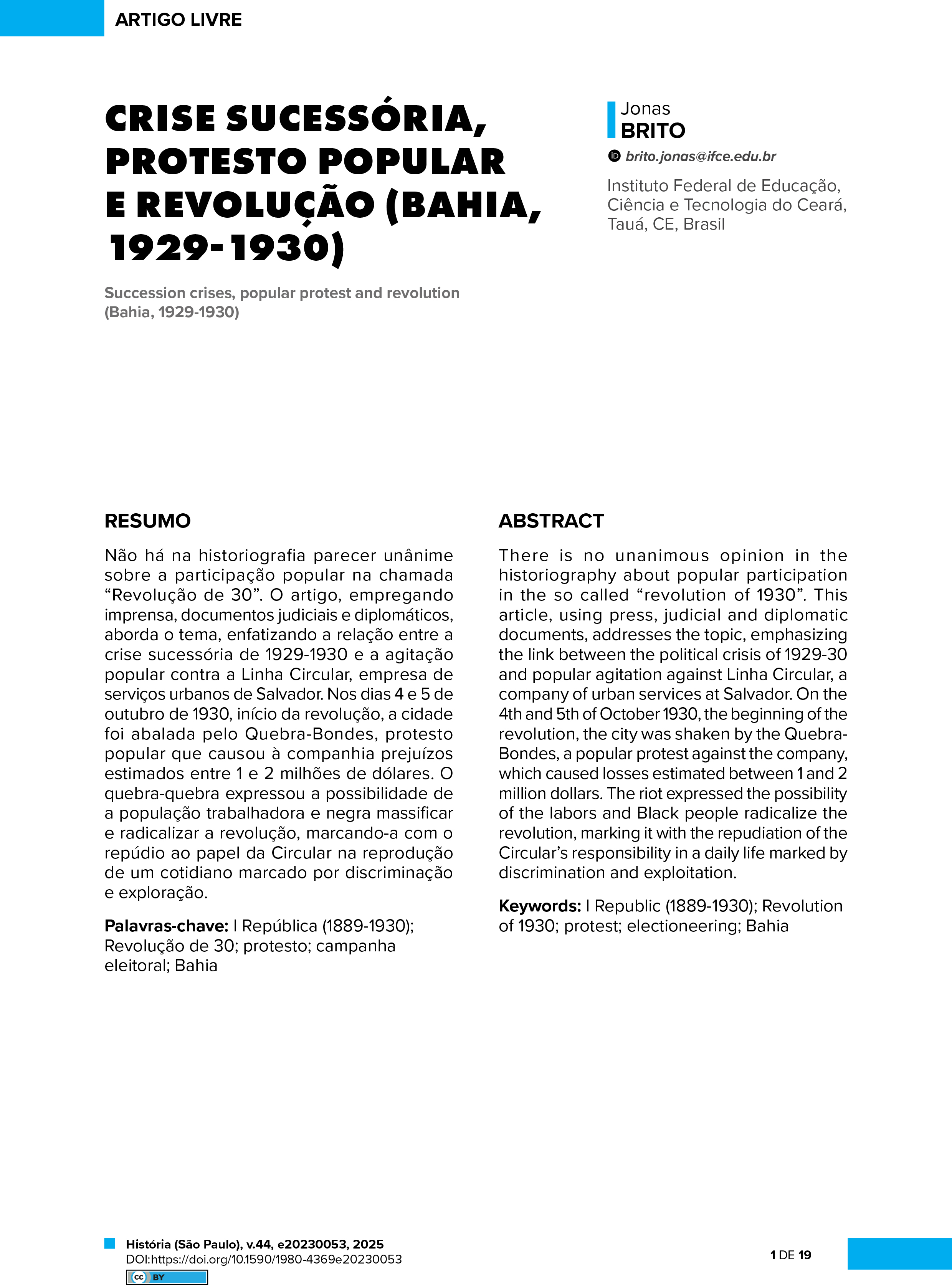 CRISE SUCESSÓRIA, PROTESTO POPULAR E REVOLUÇÃO (BAHIA, 1929-1930)